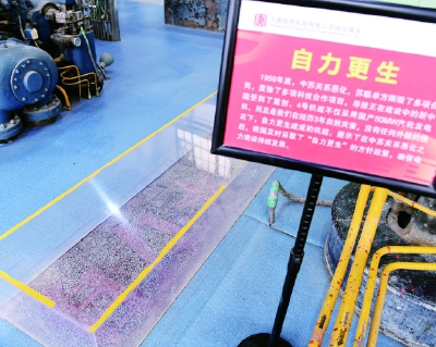 沿著紅色大道,走進蘇式建筑的辦公樓,踩著水磨石樓梯,進入連廊,一件件老物件擺放在連廊區的展柜里:二十世紀五六十年代的操作證、工作證、洗澡證等各類證件、飯盒,以及印有俄文的設備銘牌都在向參觀者講述著過去的故事。走過展區,經過電力文化長廊就進入“汽輪機檢修實操間”,也就是過去的設備車間。5臺大型汽輪機組靜靜地躺在車間里。大型轉子以及印有俄文的1號汽輪發電機還原著當時車間的原貌。操作間外地面上刻著“中蘇友好”“自力更生”等標語被玻璃罩保護著,整個車間從中蘇共建的1號機組到自建的4號機組和地面的標語刻字,反映新中國成立初期蘇聯的歷史援建和在沒有外援的情況下自力更生自建機組的發展過程。一個車間還原一段歷史,再現了二十世紀五六十年代的歷史變遷與電力文化特色。