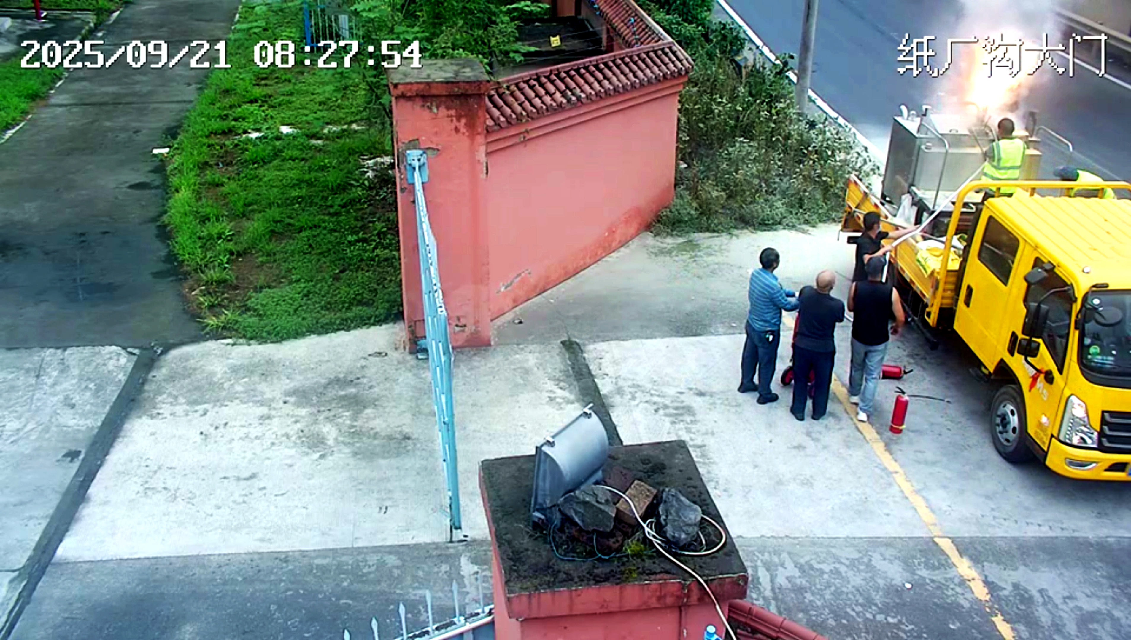 9月21日8點21分,該公司紙廠溝庫房大門前的馬路上,一輛正在執行道路劃線作業的工程車突然燃起熊熊大火。火勢迅速擴大,情況異常危急,車輛作業人員立即向距離最近的紙廠溝庫房值班人員發出求救信號。