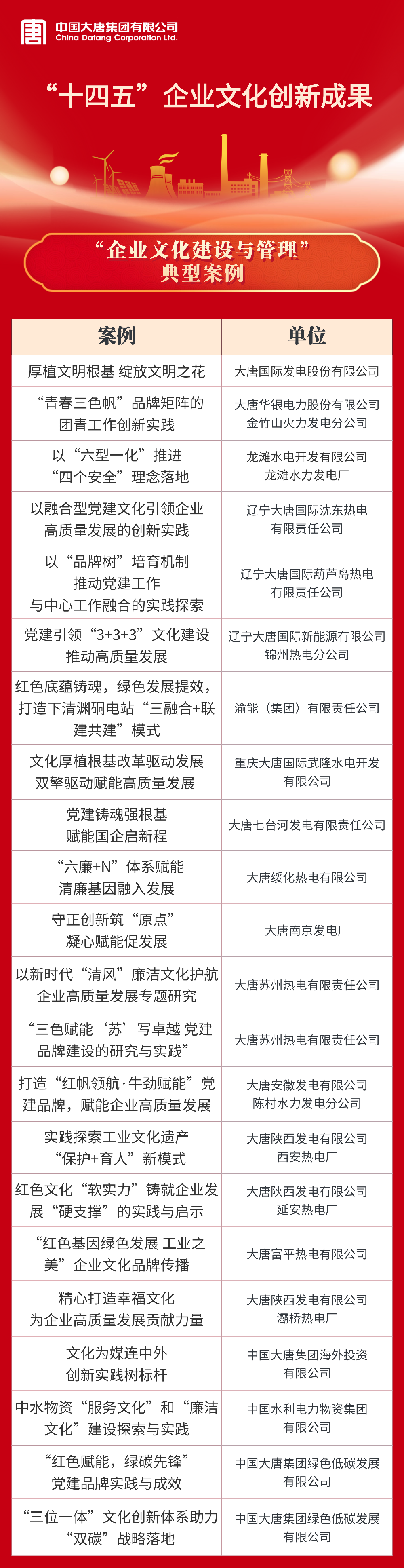 大唐國際發(fā)電股份有限公司等22家單位獲評“十四五”企業(yè)文化建設與管理典型案例;中國大唐及所屬8家單位獲評“十四五”企業(yè)文化建設與管理典型經(jīng)驗;中國大唐及所屬5家單位獲評課題研究成果一等;大唐國際發(fā)電股份有限公司張家口發(fā)電分公司等6家單位獲評課題研究成果二等。具體名單如下: