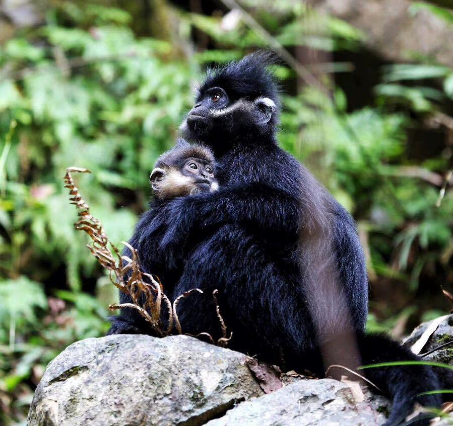 經過長途奔波,快艇行駛到貴州省沿河縣境內的“麻陽河國家級自然保護區”。山上傳來各種表達不同“情緒”的叫聲,在生態環保專業崗位奮斗8年之久的饒振祺朝密林中一指:“快看,那就是黑葉猴!發出‘嘎,嘎’的叫聲,說明它們處在愉快的覓食狀態中;‘噢、噢’就是它們在山林間攀援前進的信號。”抬眼望去,巖石間、樹蔭深處不斷有黑葉猴迅捷地跳躍。它們頭頂冠毛蓬松,通體黑色,兩頰雪白的“絡腮胡”格外醒目,看起來像銀須飄飄的“小老頭”。有的黑葉猴懷里還抱著“金寶寶”——幼猴毛色金黃,隨年齡增大變黑。