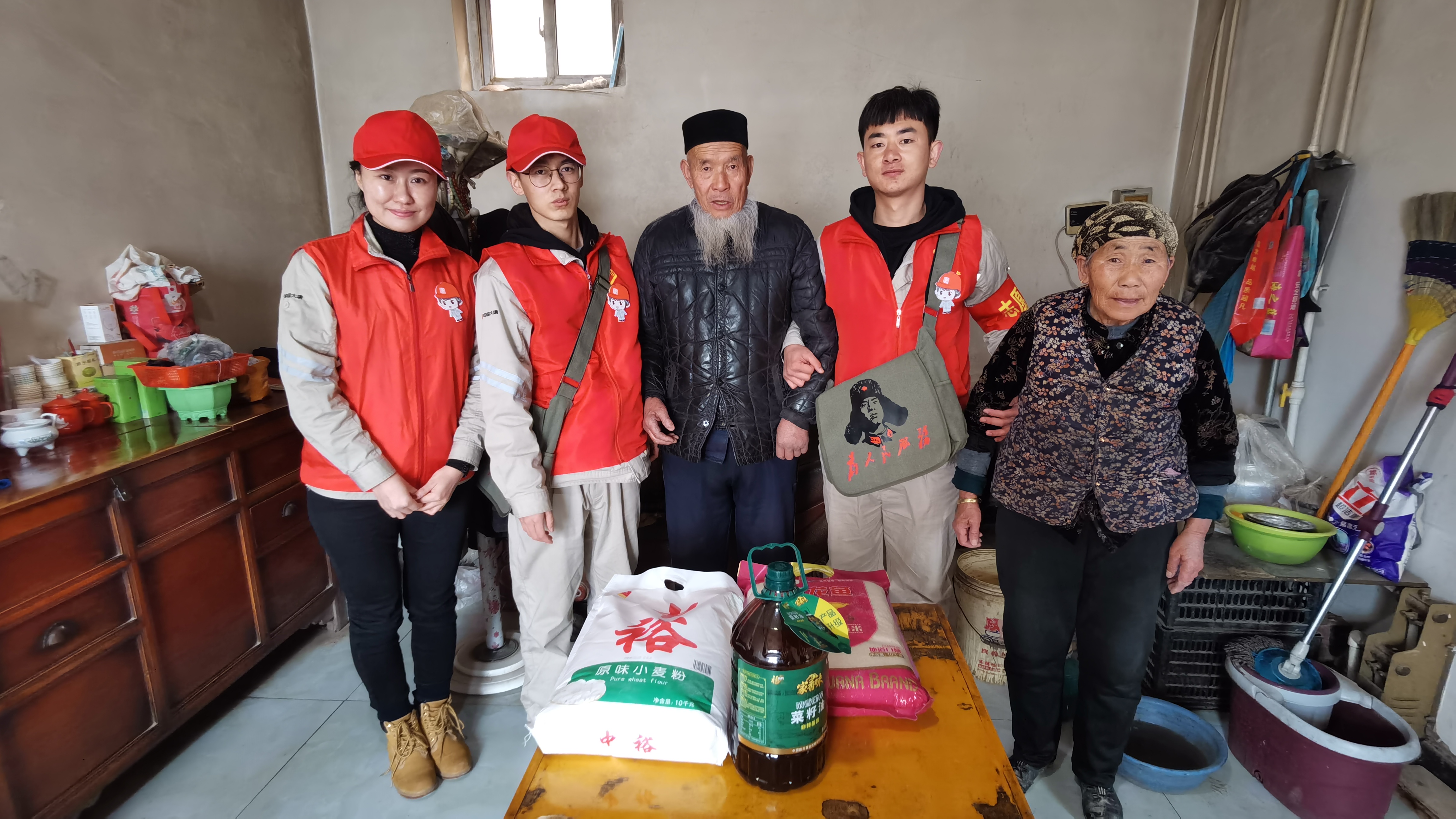 志愿者們帶著米面油等慰問品走訪慰問