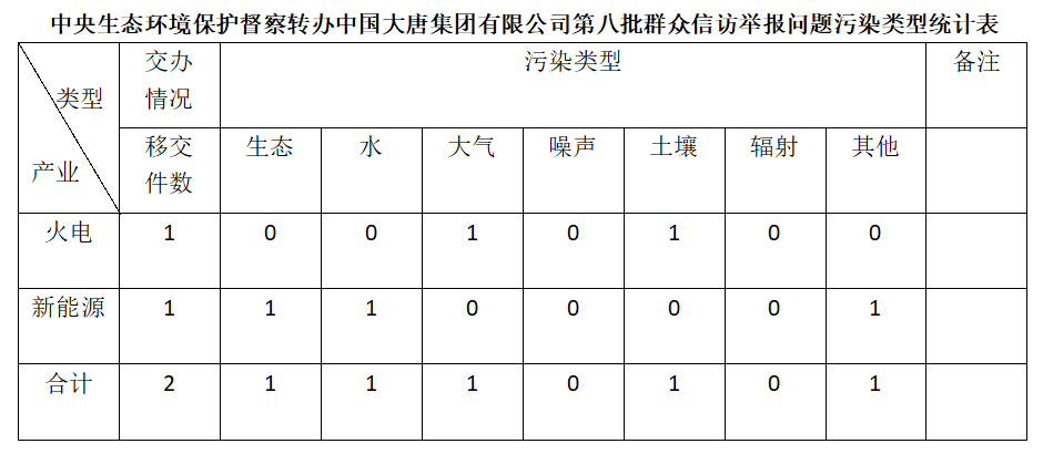 2025年6月11日,中央第七生態(tài)環(huán)境保護(hù)督察組向中國大唐集團(tuán)有限公司移交第八批群眾信訪舉報(bào)件,共計(jì)2件,均為來電舉報(bào),涉及生態(tài)問題1個、水問題1個、大氣問題1個、土壤問題1個、其他問題1個。所有舉報(bào)件辦理工作已第一時間進(jìn)入調(diào)查核實(shí)辦理程序,辦理情況將按照相關(guān)要求反饋督察組,并及時向社會公開。