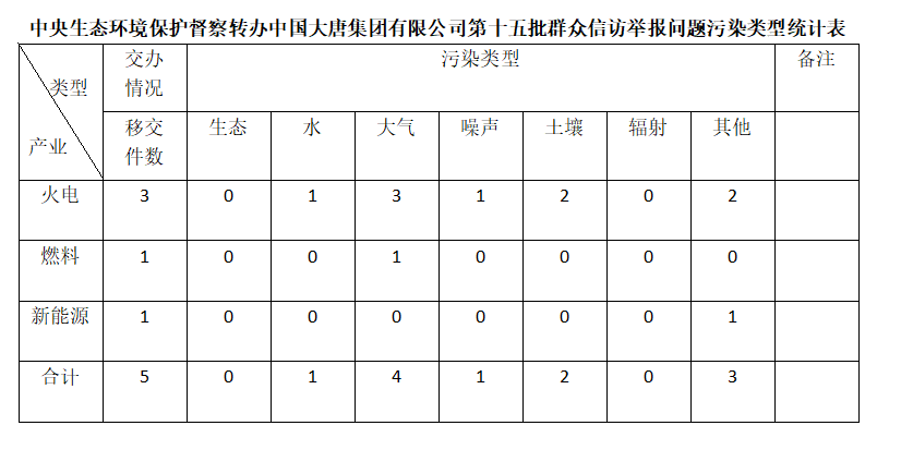 2025年6月21日,中央第七生態環境保護督察組向中國大唐集團有限公司移交第十五批群眾信訪舉報件,共計5件,其中來信舉報3件,來電舉報2件,涉及水問題1個、大氣問題4個、噪聲問題1個、土壤問題2個、其他問題3個。所有舉報件辦理工作已第一時間進入調查核實辦理程序,辦理情況將按照相關要求反饋督察組,并及時向社會公開。